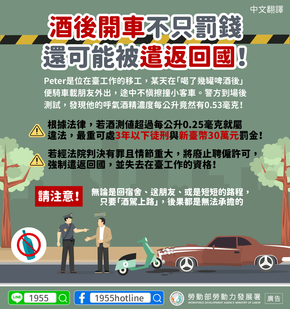 •ตามกฎหมาย ระดับแอลกอฮอล์เกิน 0.25 มิลลิกรัมต่อลิตร ถือว่าผิดกฎหมาย มีโทษจำคุกไม่เกิน 3 ปี และปรับสูงสุด 300,000 เหรียญไต้หวัน!