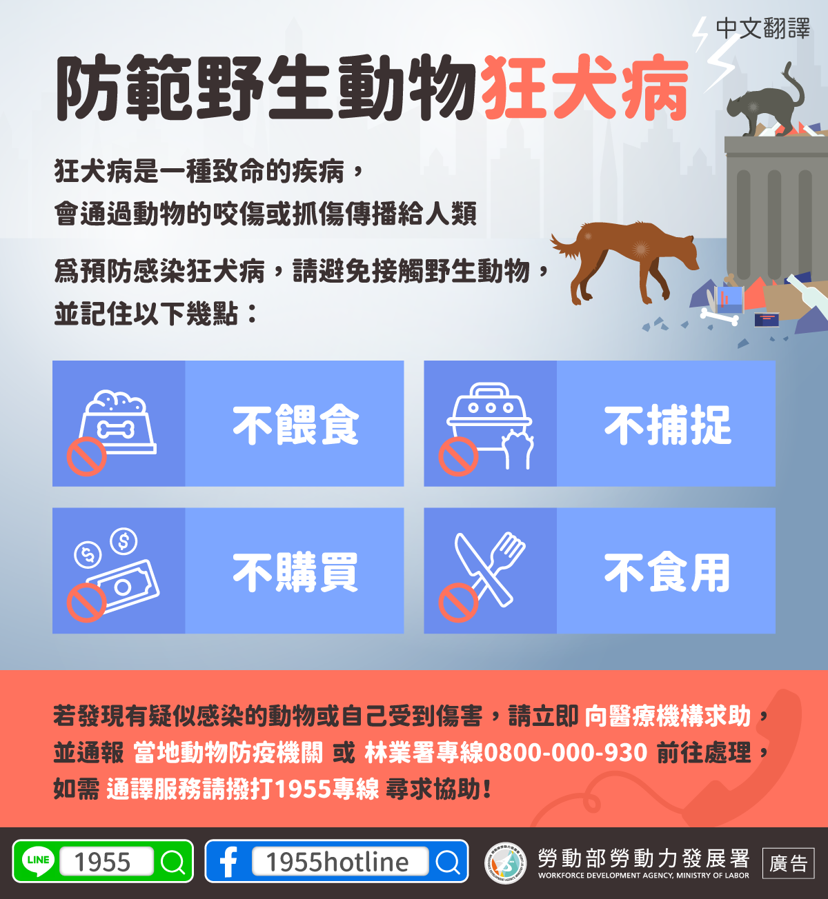 若發現有疑似感染的動物或自己受到傷害,請立即 向醫療機構求助,並通報 當地動物防疫機關 或 林業署專線0800-000-930 前往處理,如需 通譯服務請撥打1955專線 尋求協助!