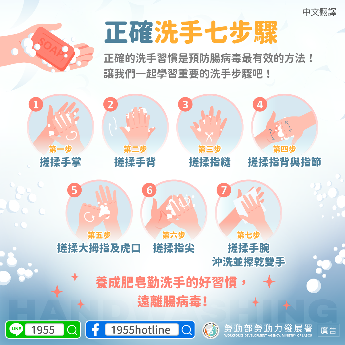 ฝึกนิสัยการหมั่นล้างมือด้วยสบู่ ห่างไกลโรคมือเท้าปาก!ป้องกันการตกเป็นเหยื่อของมิจฉาชีพ!0800-000-930 ให้รีบไปจัดการ กรณีต้องการใช้บริการล่ามแปลภาษากรุณาโทรขอความช่วยเหลือจากสายด่วน 1955!