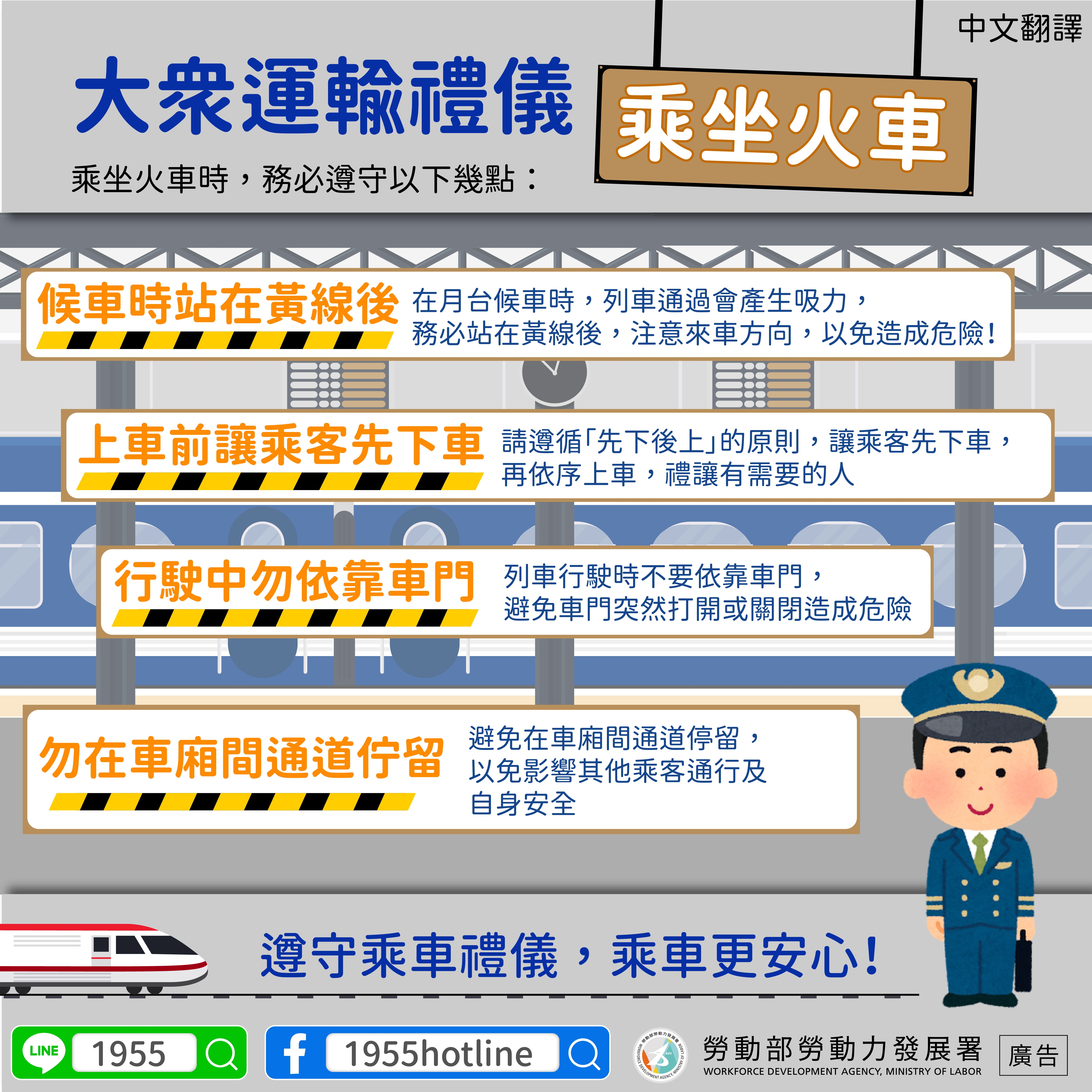 候車時站在黃線後-在月台候車時,列車通過會產生吸力,務必站在黃線後,注意來車方向,以免造成危險!