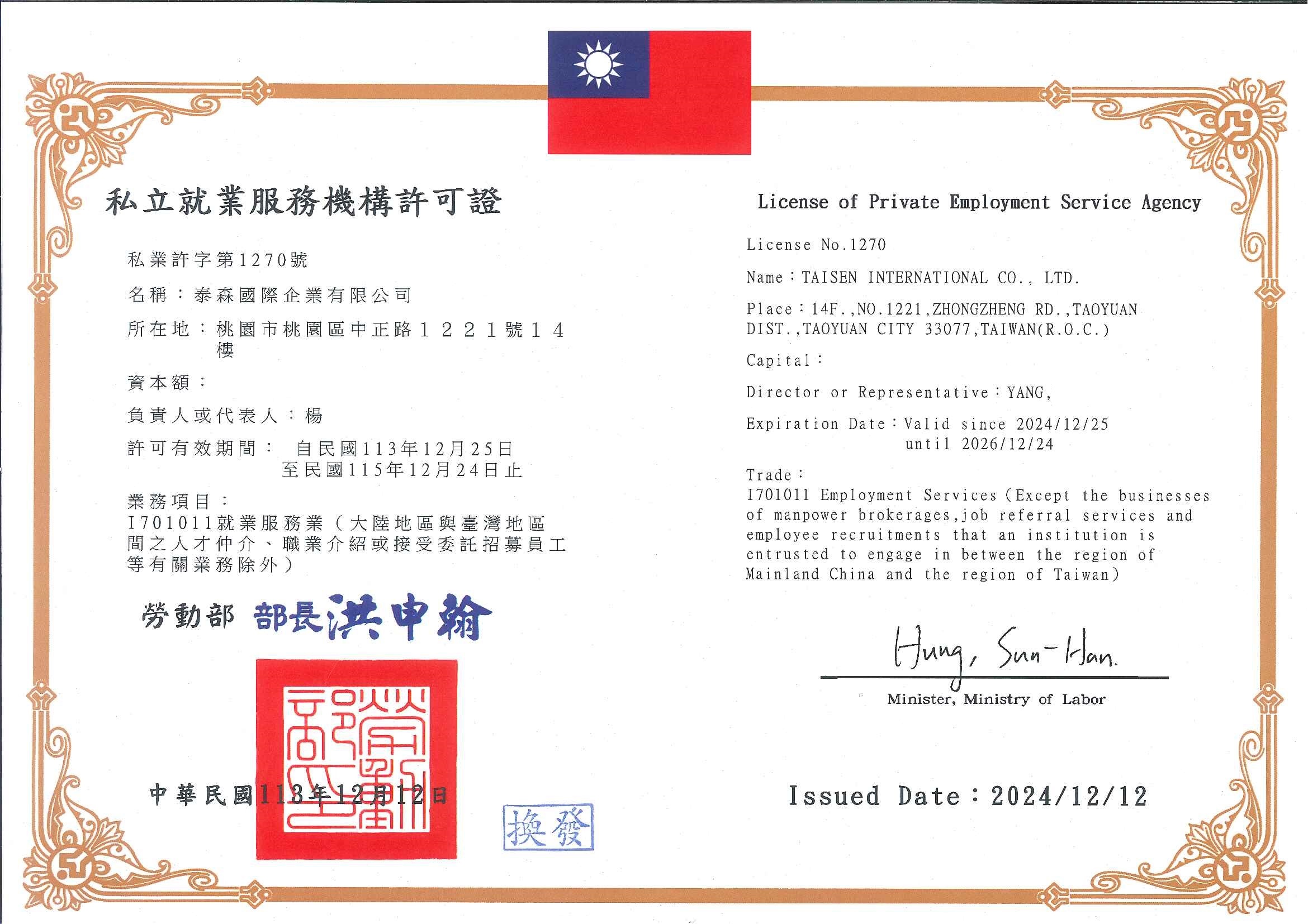 本公司於民國九十一年起全力致力於外勞引進業務。全面電腦化資訊作業.本公司與勞委會的合法外勞政策同步,從第一批開始迄今經歷各種不斷變異的外勞手續,和朝令夕改的各國外勞政策,在艱難生澀的全新外勞引進環境中,公司為忠於客戶所託,不斷的自我要求,秉持誠信專業負責態度,確實掌握進度,並隨時向客戶回報進度.我們不計成本的投資,竭誠用心服務。